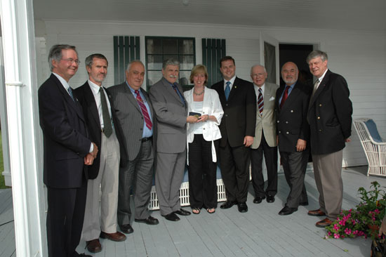 Presenting Jo Rotblat’s Nobel Peace Prize Medallion to Thinker’s Lodge (from left): Stephen Leahey, John Finney, Paolo Cotta-Ramusino, Sen. Romeo Dallaire, Sandra Ionno Butcher, Nova Scotia Premier Rodney MacDonald, Douglas Roche, Jonathan Granoff, Colin Dodds